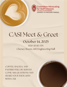 You’re invited to the Committee Advocating for Staff Interests (CASI) Meet and Greet on October 14 in the Cheney Room (1413 Engineering Hall)! Join us for bagels and coffee and meet your CASI representatives. Feel free to stop by anytime between 8:30 am-10:30 am. Bring your comments, questions and concerns!