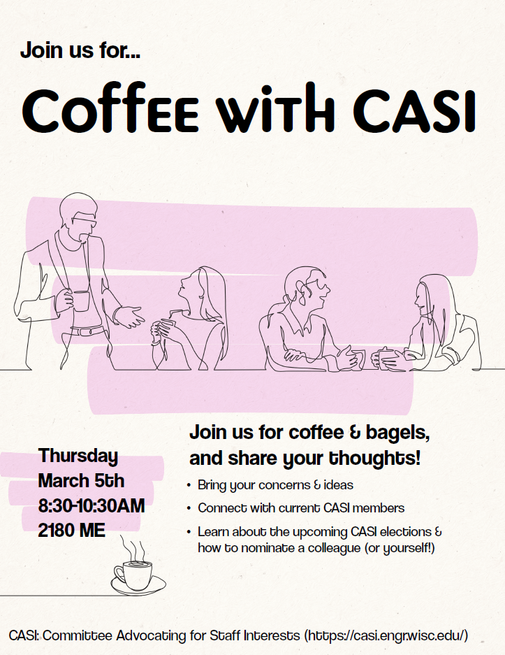 Come join us for coffee and bagels on Thursday, March 5, 2026 in room 2180 Mechanical Engineering! Meet the CASI Board and share any staff news or concerns.